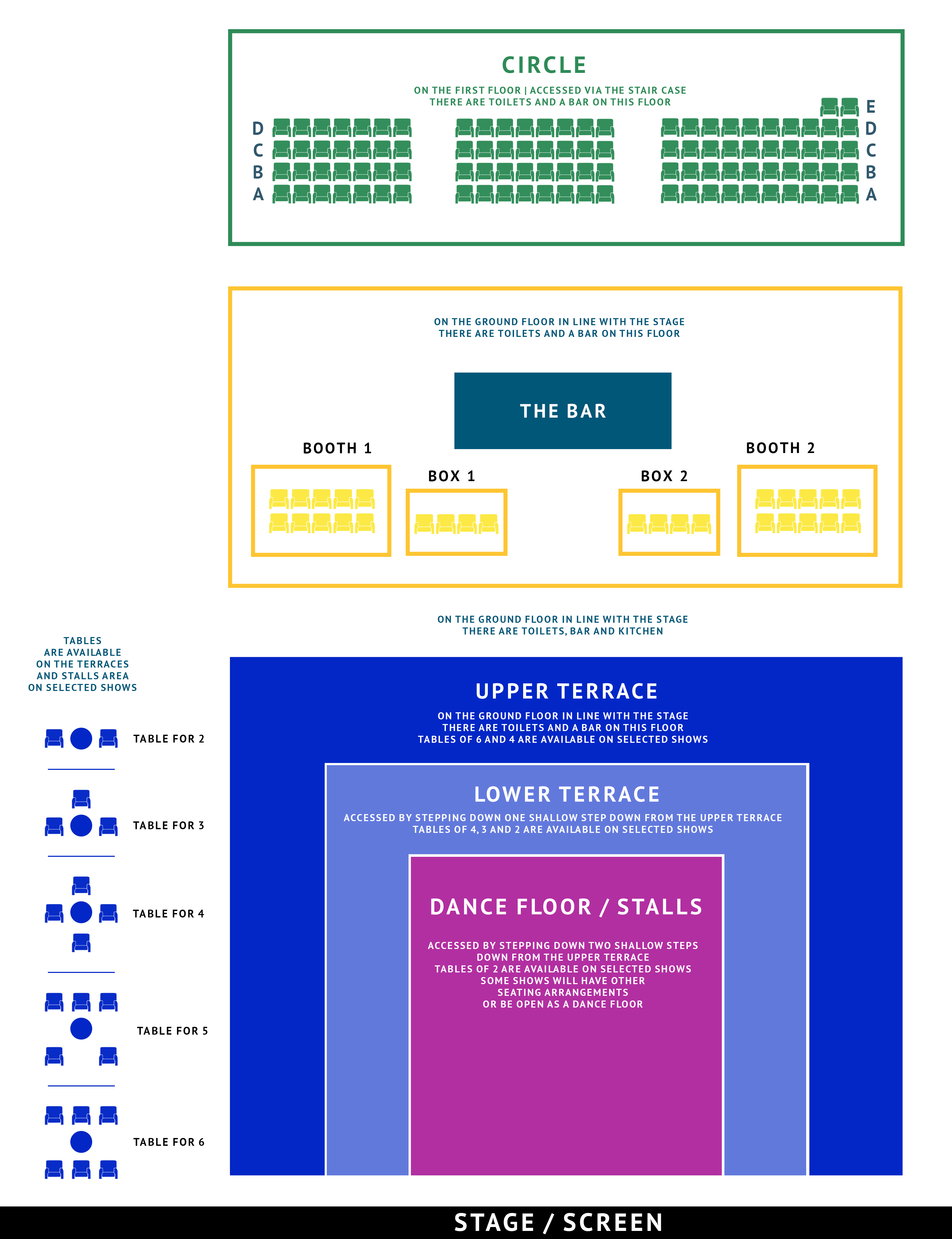 The venue is one auditorium with the Stalls, Terraces, and Boxes on the ground floor and the Circle on the first floor.